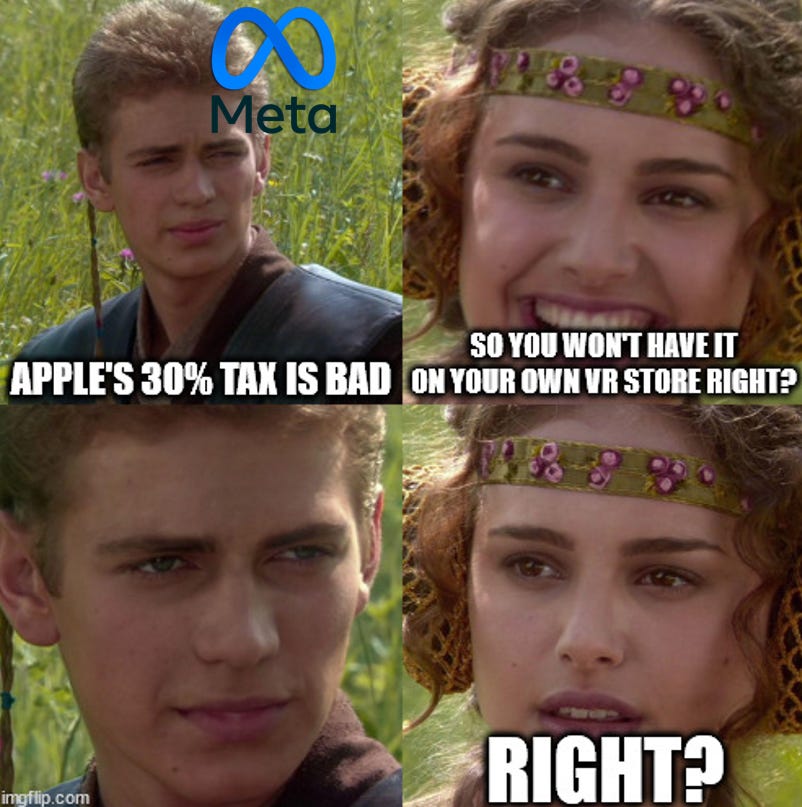 Meanwhile competitors like Meta who have complained for years about Apple’s taxes have copied their designs of walled garden hardware; Meta adhered to the same standard when it launched its own “Quest Store” despite publicly positioning itself as a committed investor to the metaverse and its builders.