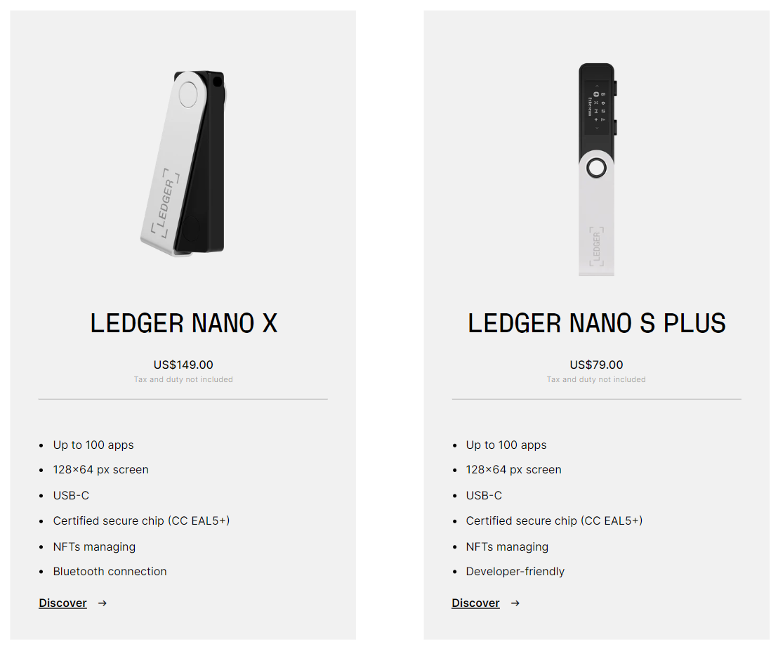 Over the years, the company has released several hardware wallet models, starting with the Ledger Nano in 2014. The Ledger Nano S, introduced in 2016, was the company's flagship product for years, as it offered enhanced security and a streamlined user interface. In 2019, Ledger released the more advanced Ledger Nano X, which features Bluetooth connectivity and expanded storage for multiple cryptocurrencies. In 2022, the company introduced the Ledger Nano S Plus and the Ledger Stax, the latter of which has some features tailored to NFT users.