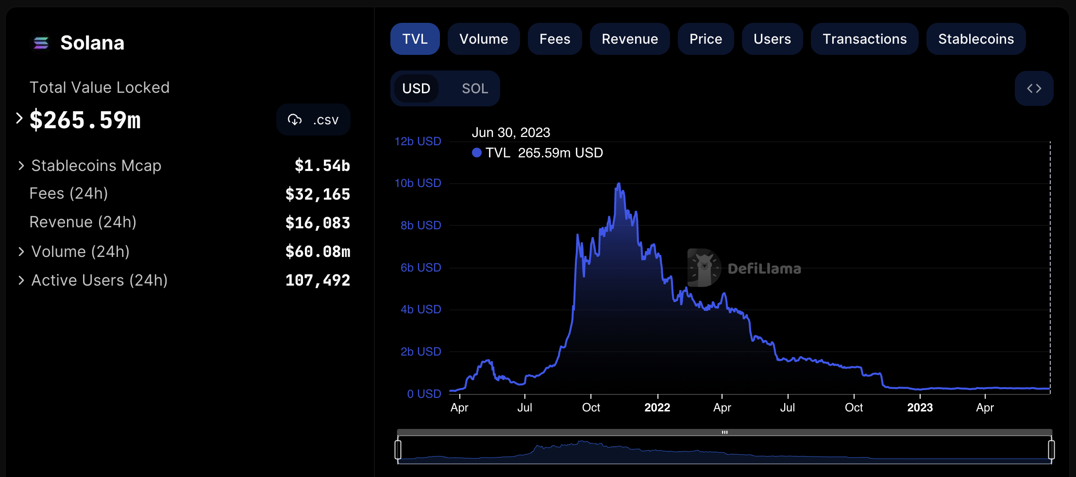 As of the latest update to this guide (June 30, 2023), the total value locked (TVL) in the Solana DeFi ecosystem was worth the equivalent of ~$266M USD according to DefiLlama. That current TVL level pales in size compared to Solana’s last TVL peak of ~$10B, but nevertheless it still made the network the 11th-largest DeFi network at the time of writing.