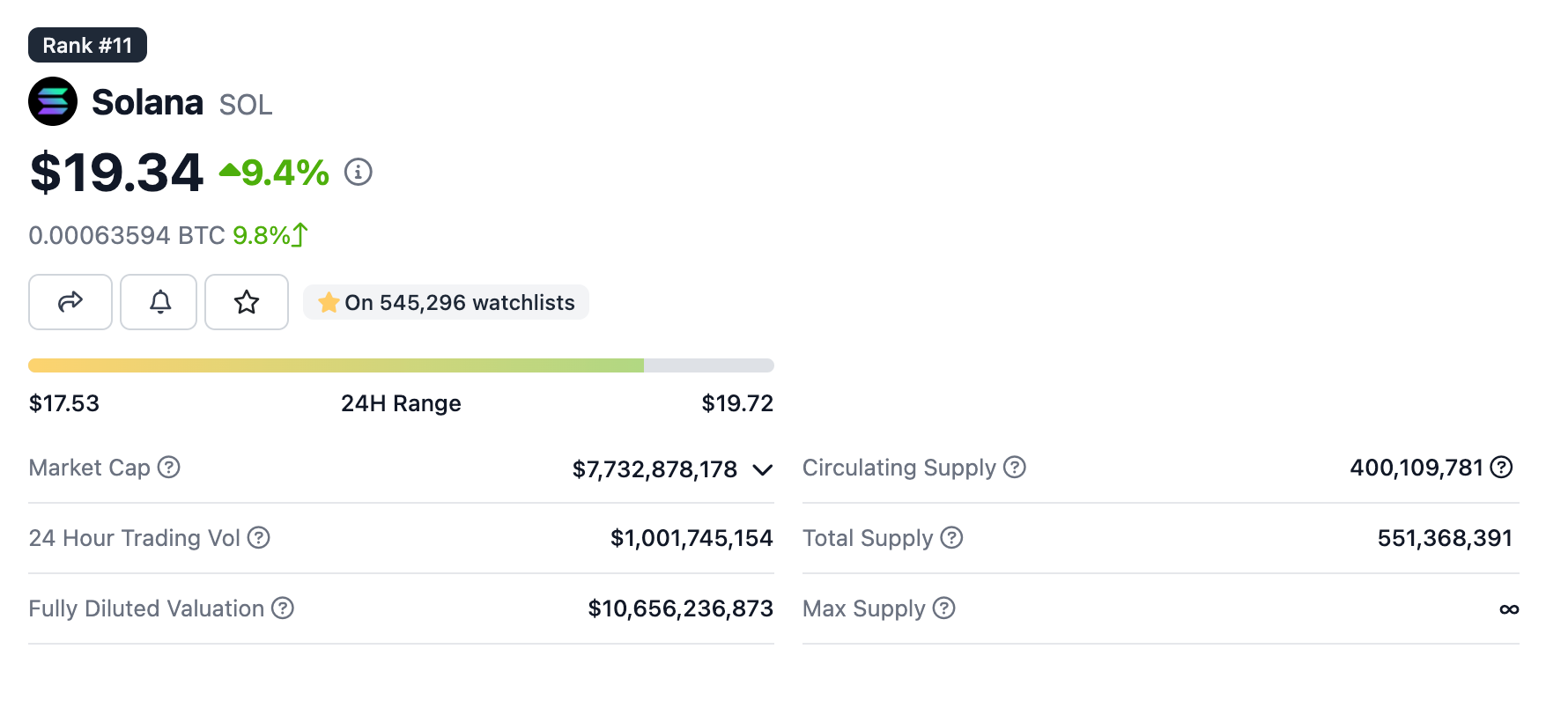 As of the most recent update to this guide, SOL was trading at approximately $19.34 USD, boasting a market capitalization of $7.73B. This positioned it as the 11th-largest cryptocurrency in the cryptoeconomy. At the time, the SOL circulating supply stood at slightly over 400 million, with a total supply of more than 551M that steadily increases per staking rewards.