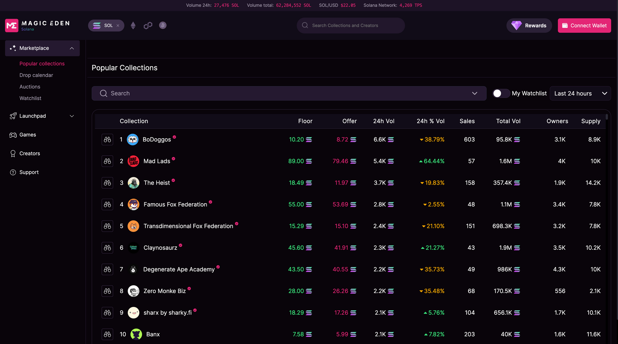 Magic Eden has become the leading NFT marketplace on Solana, offering a one-stop platform for users to discover and trade Solana NFTs. In addition to its core secondary marketplace, the platform features a Launchpad service for exclusive minting projects and partnerships with NFT brands. Users can also explore NFT gaming through Eden Games, which focuses on supporting game creators and their communities.