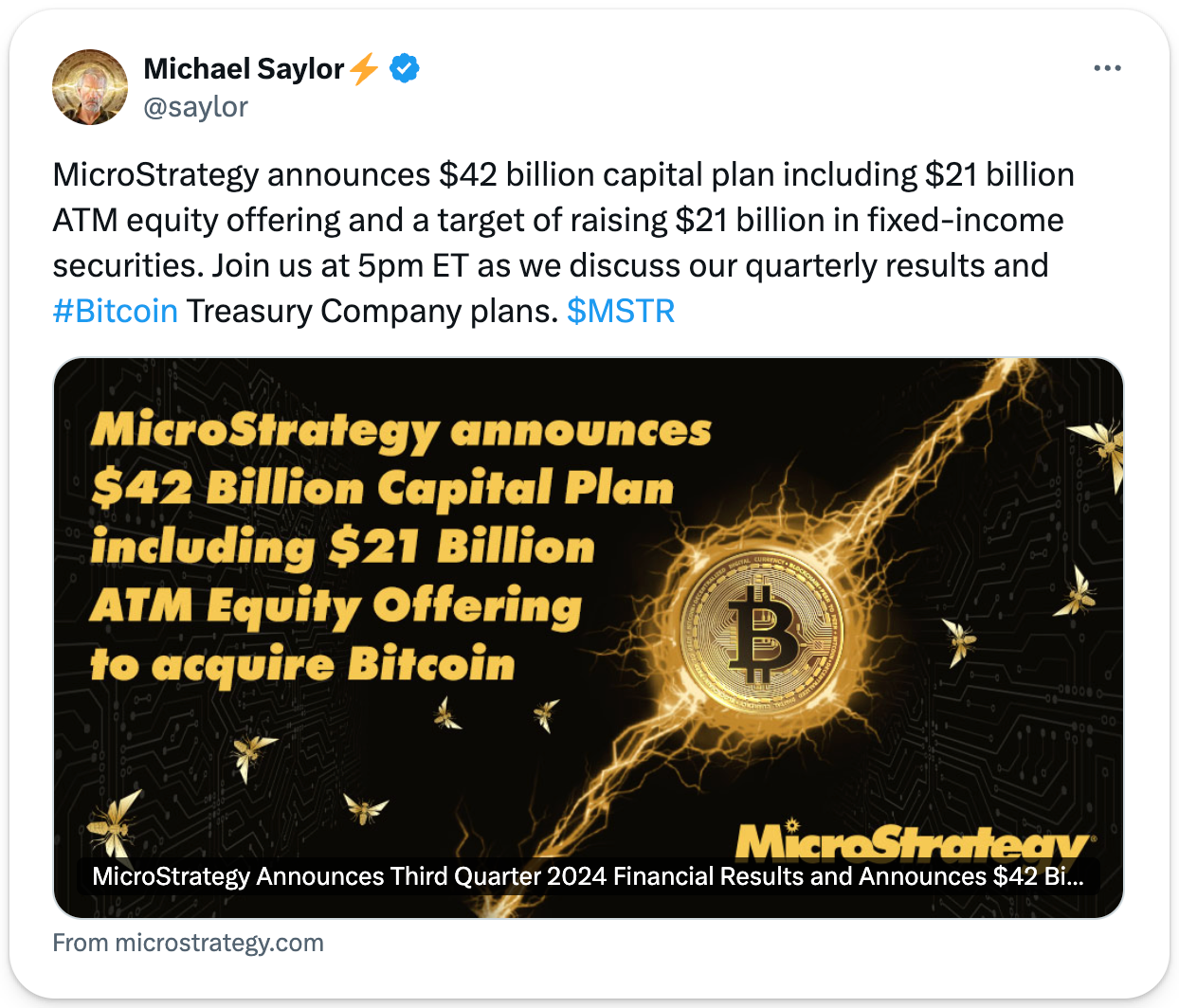 Despite missing quarterly revenue expectations, Michael Saylor’s MicroStrategy announced its plan to raise $42B over the next three years to buy more Bitcoin.