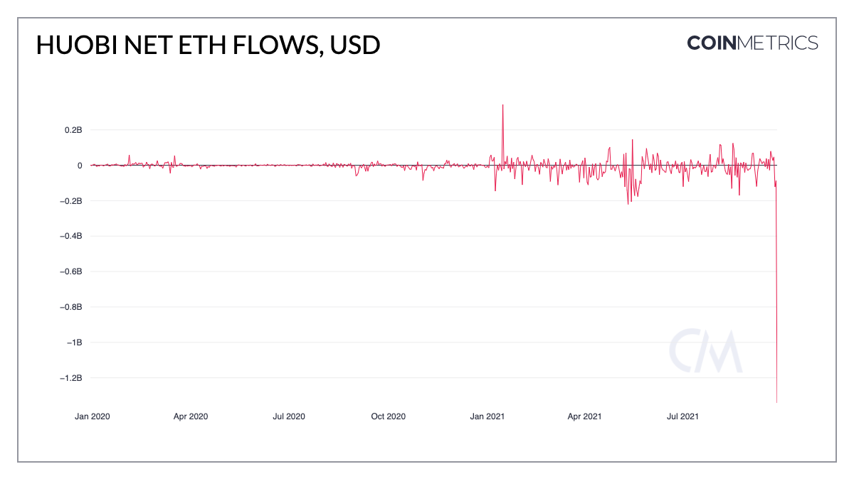 Huobi had a net outflow of $1.34B worth of ETH (440K ETH) after announcing they will cease all activity for users from mainland China.