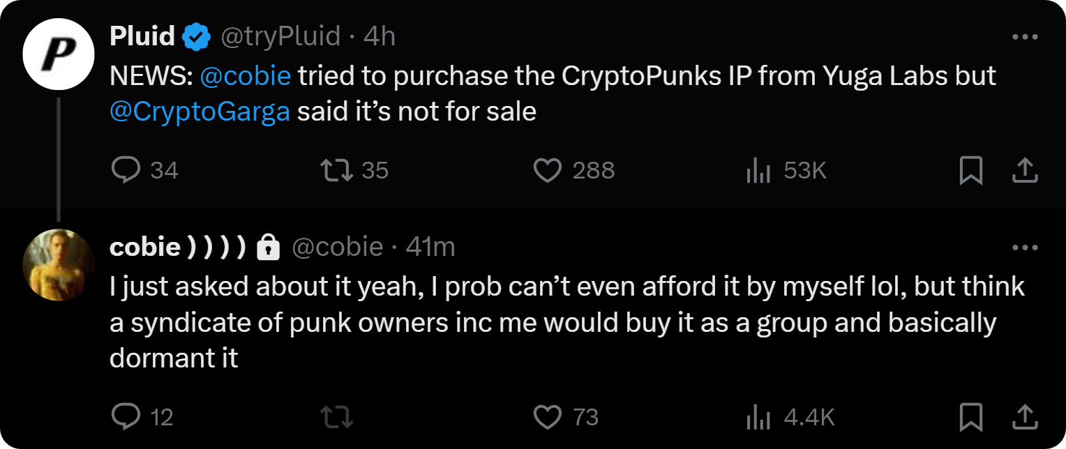 Defensible or not, this licensing kicked off a new wave of controversy, even prompting longtime crypto veteran and CT darling Cobie to admit he recently asked Yuga if he could acquire the 'Punks IP from them (they declined).