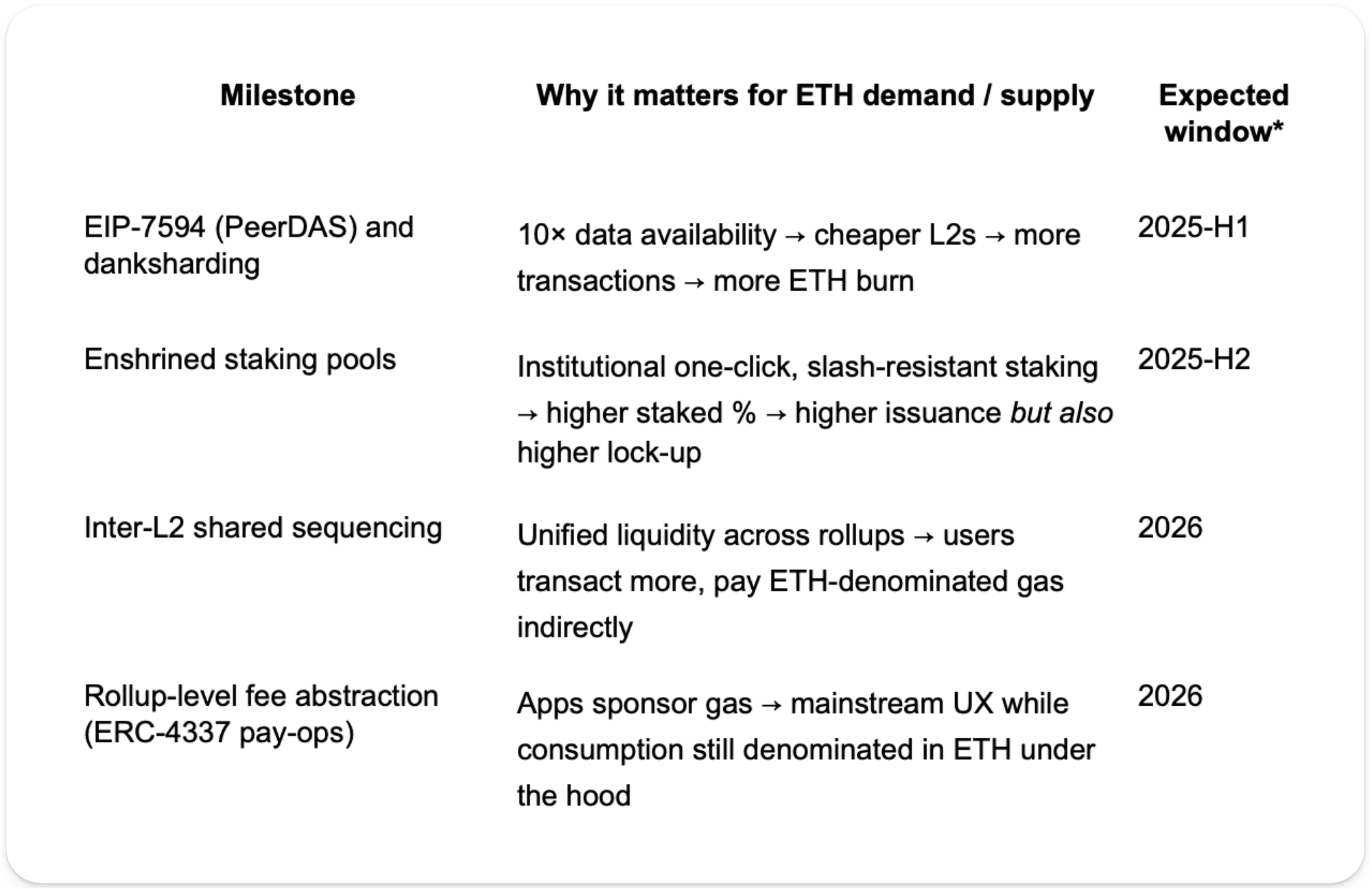 Each milestone reduces friction or increases functionality, broadening Ethereum’s total addressable economic surface area, while leaving the supply curve unchanged. This creates an asset whose demand scales with technological progress, but whose supply remains structurally constrained.