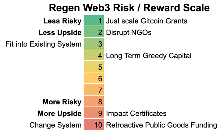 In this article, we evaluate emerging models according to a Regen Web3 Risk/Reward Scale. Projects at the top of this scale are already working today, while those at the bottom are more theoretical with upside potential.