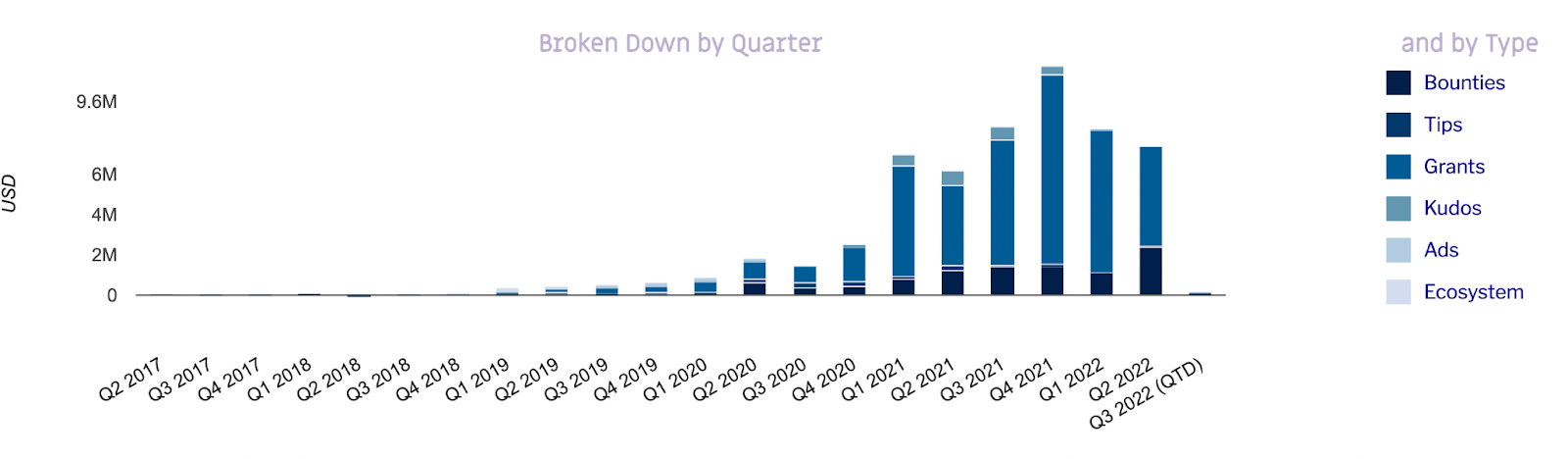 In Q2 2022, Gitcoin facilitated $7.4m in value transfer. That's about $3413/hour, for every hour during Q2 ($15374/business-hour).