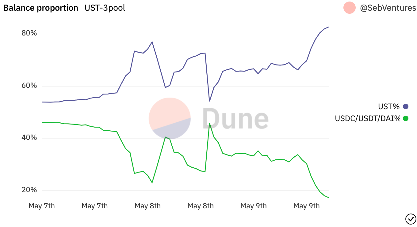 • The UST-3CRV Curve pool, the most liquid pool for the stablecoin on Ethereum, has also become imbalanced, currently at a ratio of ~81.2% UST to ~18.8% 3CRV. The pool, which first became imbalanced on May 7, intends to have a 50/50 split between UST and 3CRV (the base trading pool for stablecoins on the DEX which consists of USDC, USDT, and DAI). While it holds just ~3.4% of the total UST supply, liquidity drying up may prove to have a significant impact on the market psychology and confidence in the stablecoin.