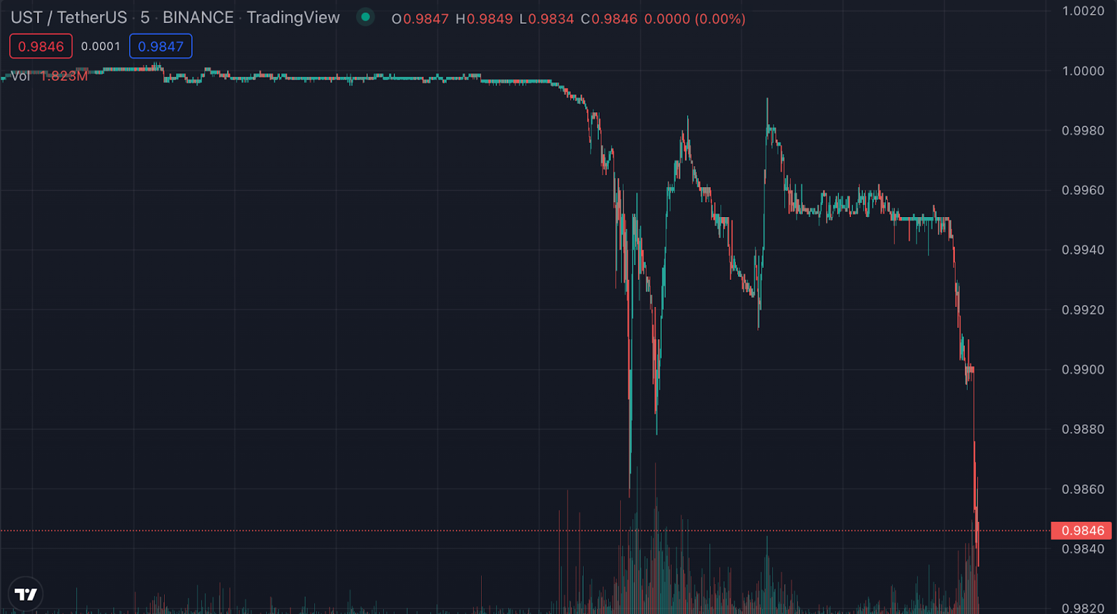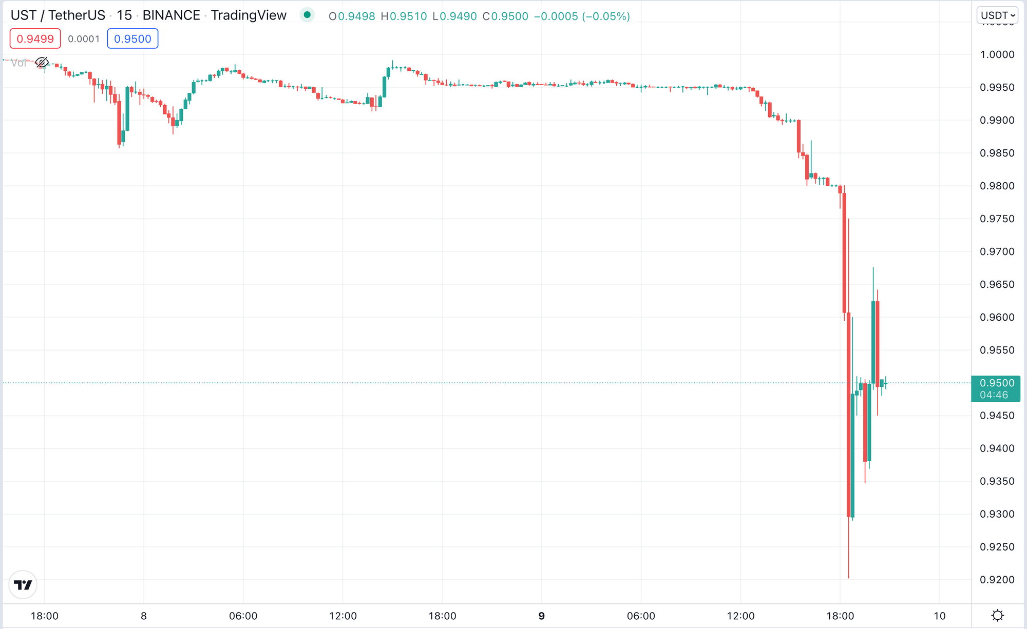 UST, the algorithmic stablecoin of the Terra ecosystem, is currently in a battle for it’s life. UST has been trading below $1.00 for the last 3 days, but just this morning it broke down and hit a low of $0.92.