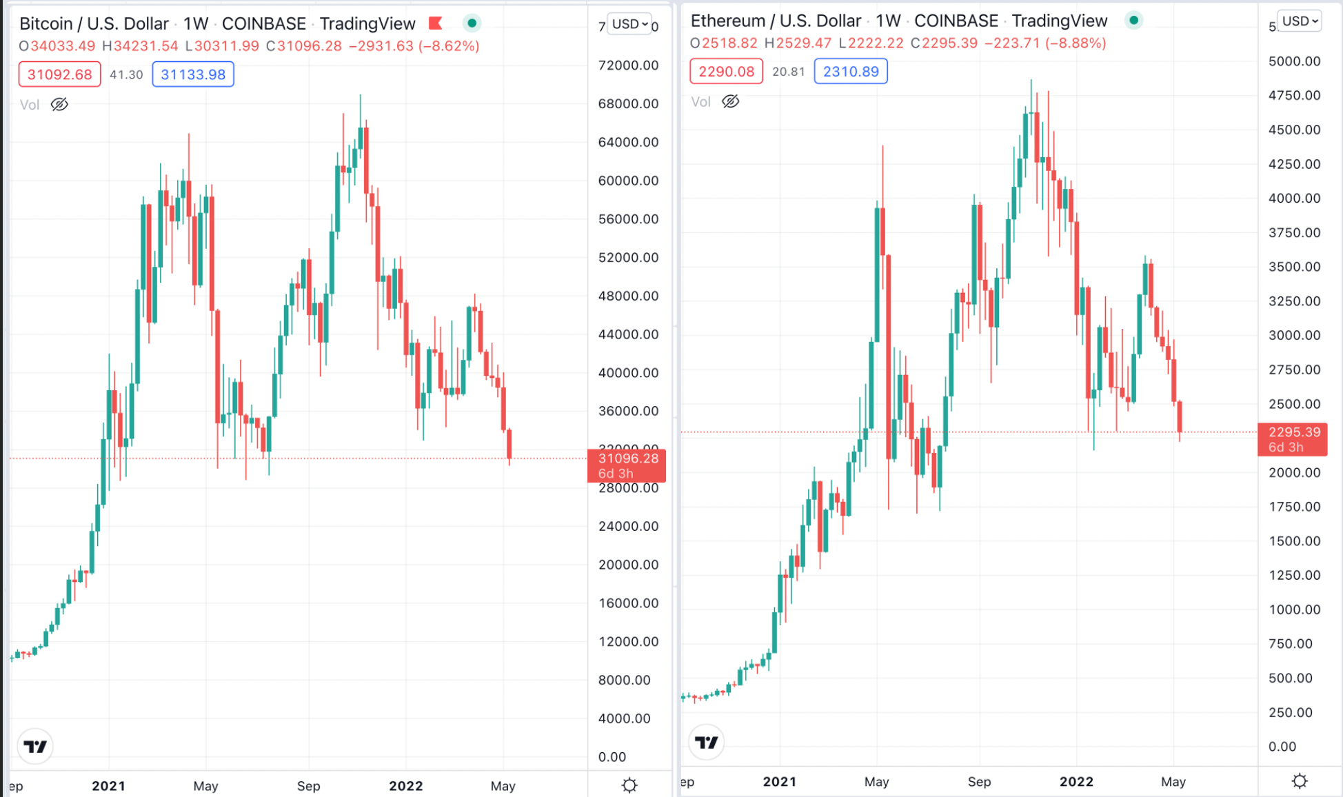 The rapid destruction of ~$250b in total crypto market cap has cascading effects upon the rest of the crypto markets, of course. Crypto is no stranger to cascading liquidations, where the liquidations of leverage positioned trigger even further liquidations.