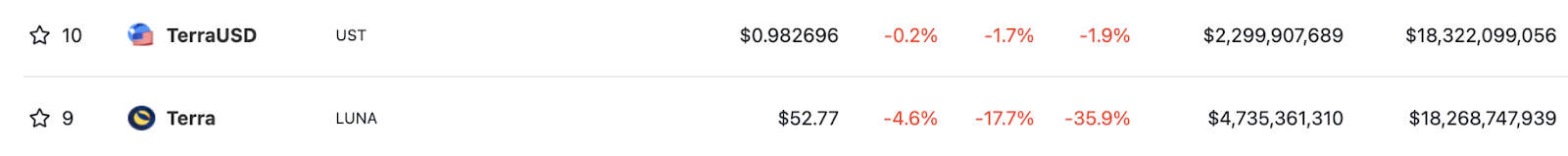 UST and LUNA Market Capitalization - Source: Coin Gecko