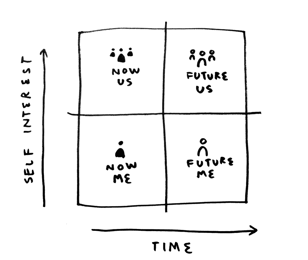 Bentoism (an acronym for BEyond Near Term Orientation) is a wider lens for what's valuable and in our self-interest. This includes what I as an individual want and need right now (Present Me). But it also makes space for the considerations of our future selves (Future Me), the people we rely on and who rely on us (Present Us), and the next generation (Future Us).