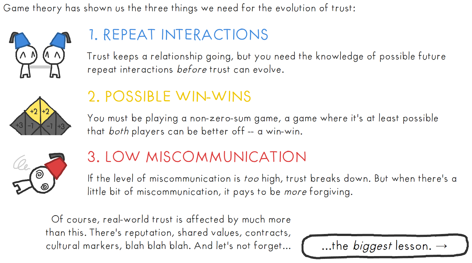 Nicky Case, a game designer, has created an HTML5 game which allows end-users to explore how trust—which is a high order bit when you are designing for communities that coordinate—evolves in communities.