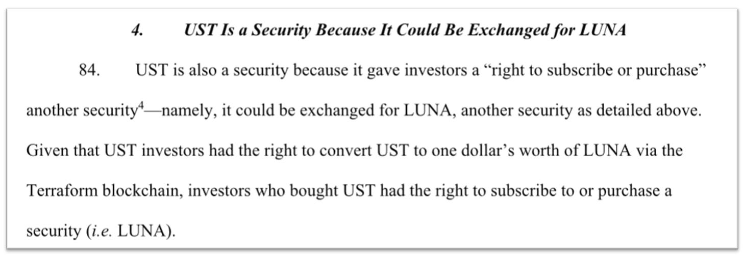 The SEC’s lawsuit against Do Kwon and Terraform Labs last week alleges that the UST stablecoin is a security because it was a “right to subscribe or purchase” another security i.e., it was convertible to LUNA.