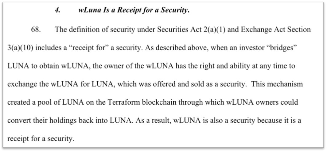 In addition, the SEC argues wLUNA, a wrapped asset, would count as a security in itself because it is a “receipt” for a security in turn.