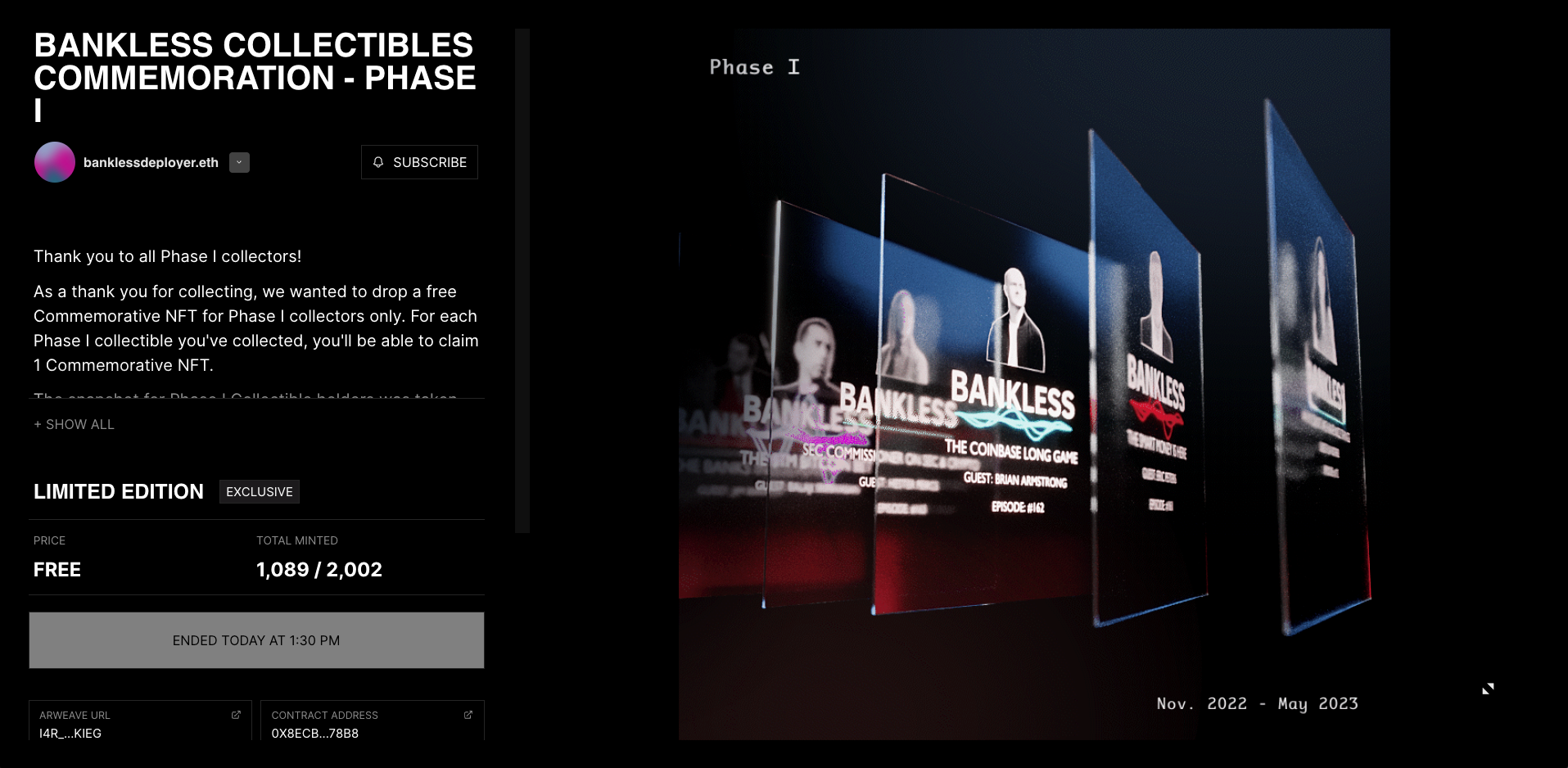 The claim period for the Bankless Collectibles Commemoration - Phase I NFT is now officially over as of yesterday, June 14th, 1:30pm PST.