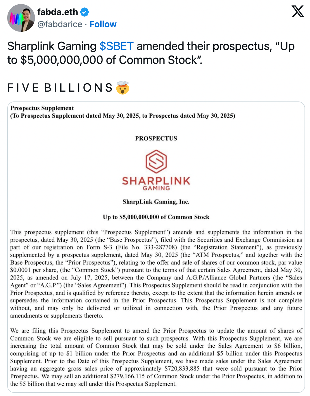 On Thursday, Sharplink filed an updated prospectus showing plans to raise up to $6B by selling stock to buy more ETH, increasing the amount by $5B over its previous target. According to Arkham, the company’s treasury now holds over $961M in ETH, most of it in LSETH, a yield-bearing staking token issued by Liquid Collective.