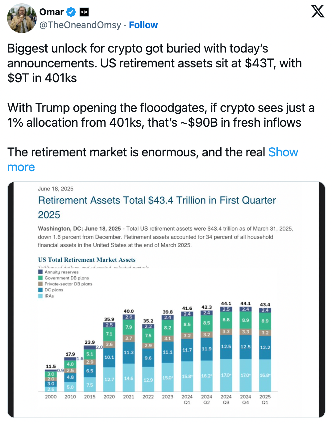 Donald Trump is preparing to sign an executive order that would open up $9T in retirement savings to alternative investments, including digital assets, precious metals, and private equity.