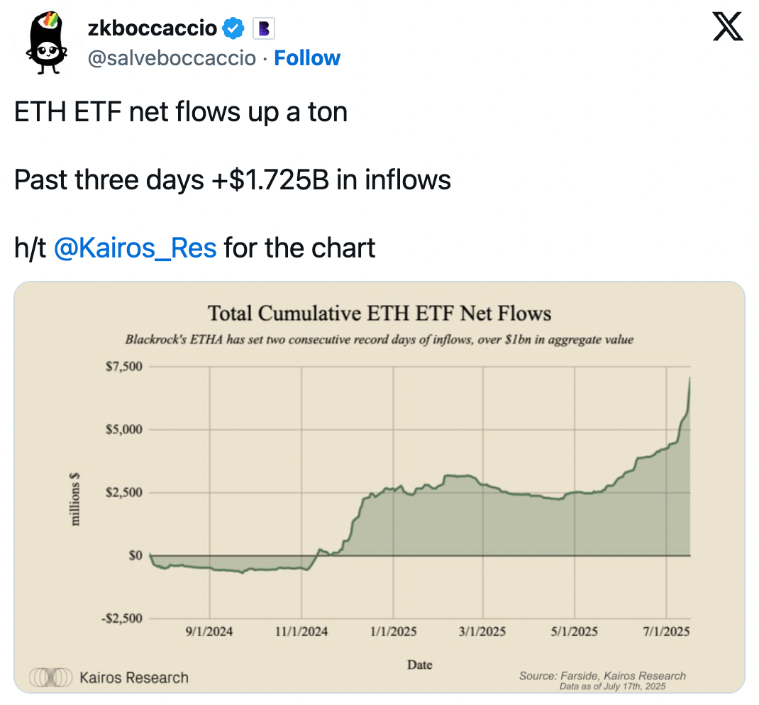 Ethereum ETFs kicked into overdrive this week, sucking in cash like a black hole as inflows went parabolic. Barring one day of outflows on July 2, ETH ETF assets under management have been up-only throughout July, raking in an astonishing ~$3.2B of net inflows on the month.