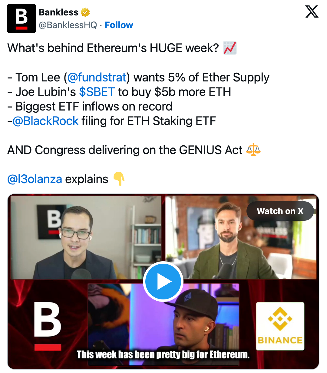 But perhaps more importantly, Bitcoin's new all-time high, Ethereum's rising institutional interest, and Tom Lee's goal of acquiring 5% of ETH supply.