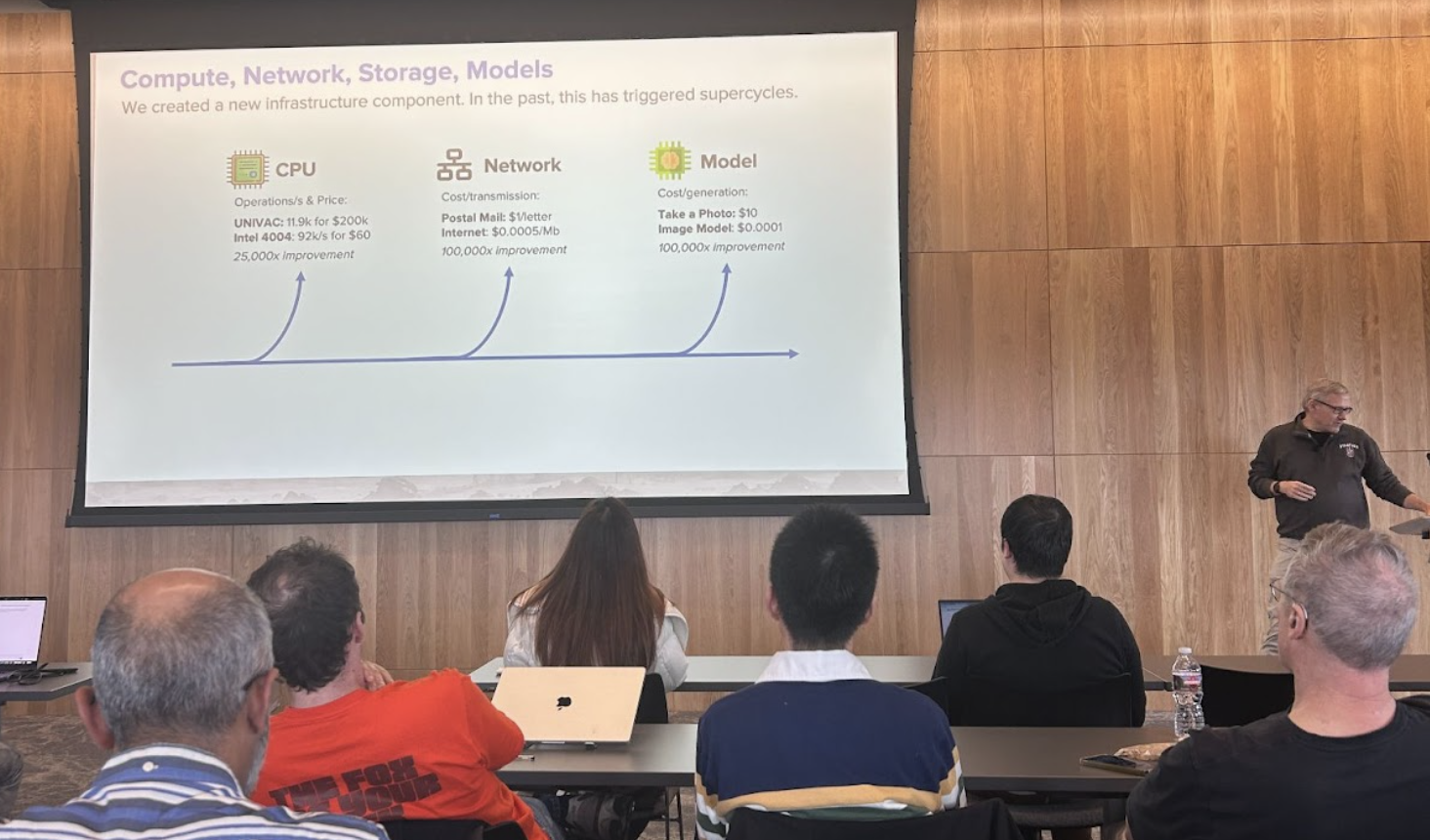 In his talk, Guido Appenzeller of a16z drew a comparison between AI's rapid cost declines and historical technology-driven economic shifts. He explained that whenever costs drop by five orders of magnitude, new supercycles tend to emerge (see image above). Today, we can train an AI model on the entire Harry Potter series for just $0.15, something unthinkable just a few years ago. He also referenced Jevons Paradox, noting that while automation reduces costs, it can paradoxically lead to more employment rather than less – since AI-enhanced workers become more productive and in demand.