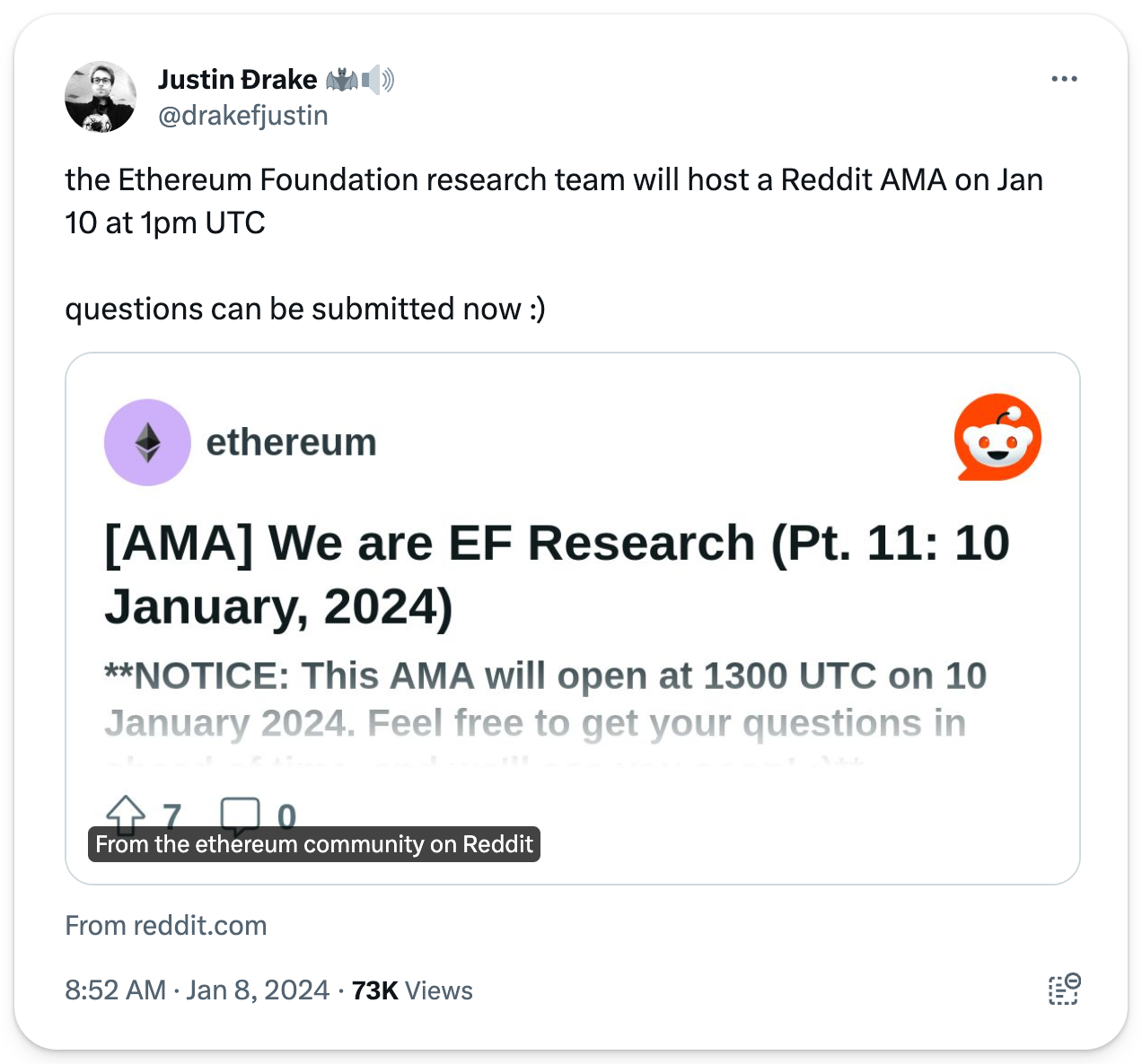 This week, the r/ethereum subreddit held its latest AMA with Ethereum Foundation researchers, featuring Vitalik Buterin, Justin Drake, Dankrad Feist, and more. The session covered a wide range of topics related to future development and current pitfalls.