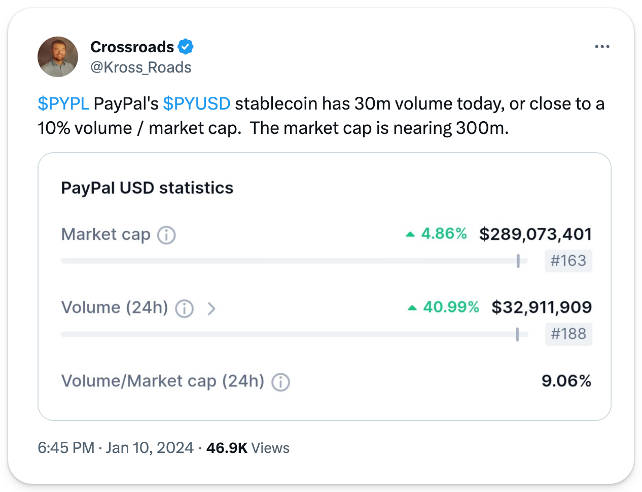 Indeed, this week, chatter grew around PayPal’s stablecoin, which has seen its market cap swell +70% over the past month to nearly $300 million.