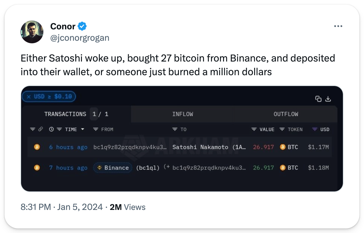 Binance account sent 26.9 BTC ($1.15 million) to the first-ever Bitcoin “Genesis” wallet, which was created and owned by Satoshi Nakamoto.