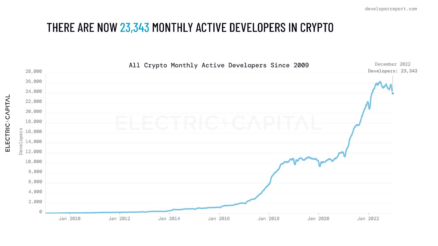 Despite layoffs from some big players last year, total crypto developers remain close to its highs with 23,343 monthly active devs according to the report.