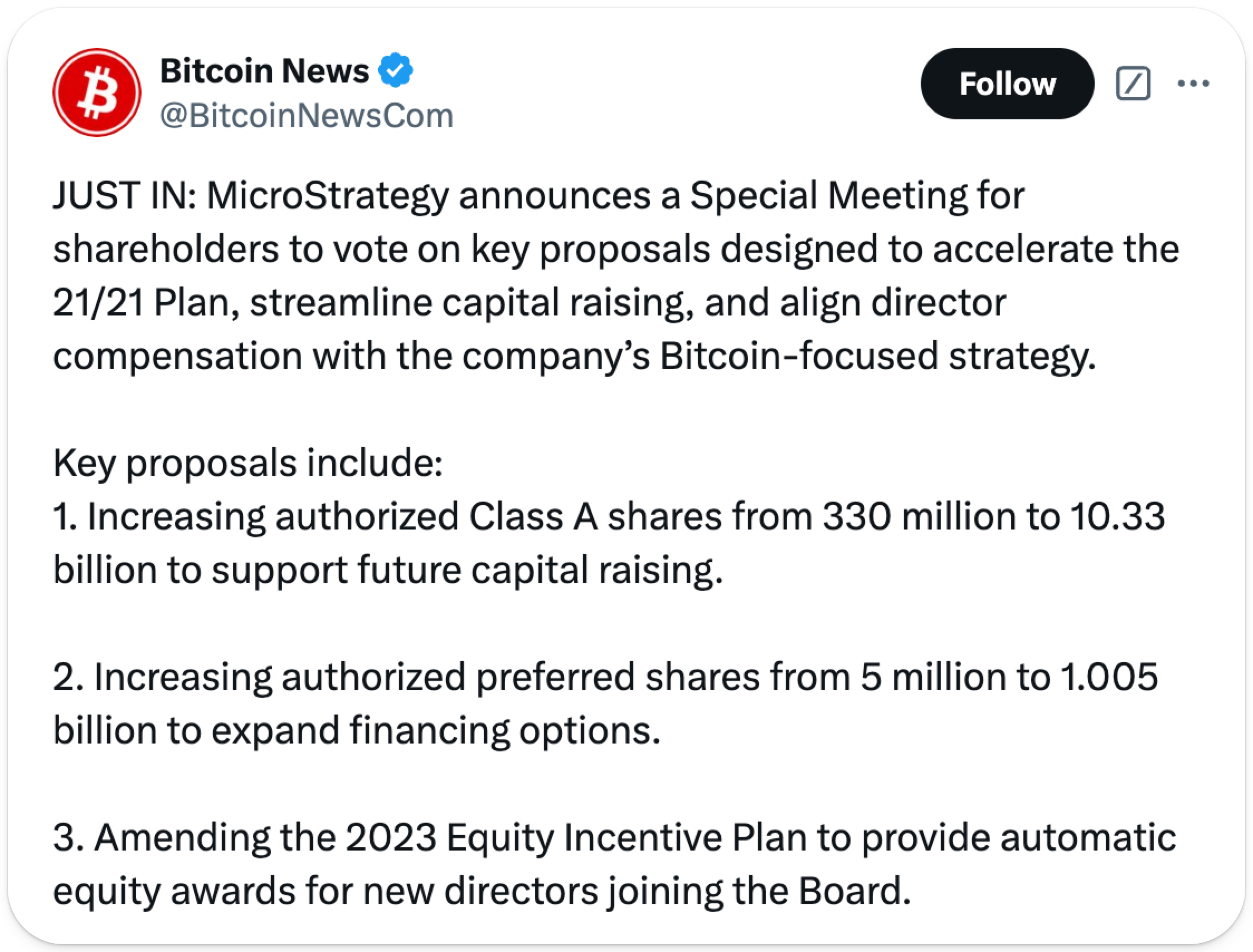 Shareholders will be asked to increase the amount of authorized MSTR common stock for sale to 10.33B shares, worth $3.5T at the time of this analysis. Additionally, the revised plan seeks to increase authorized preferred shares to 1.005B and approve automatic equity awards for new members who join the Board.