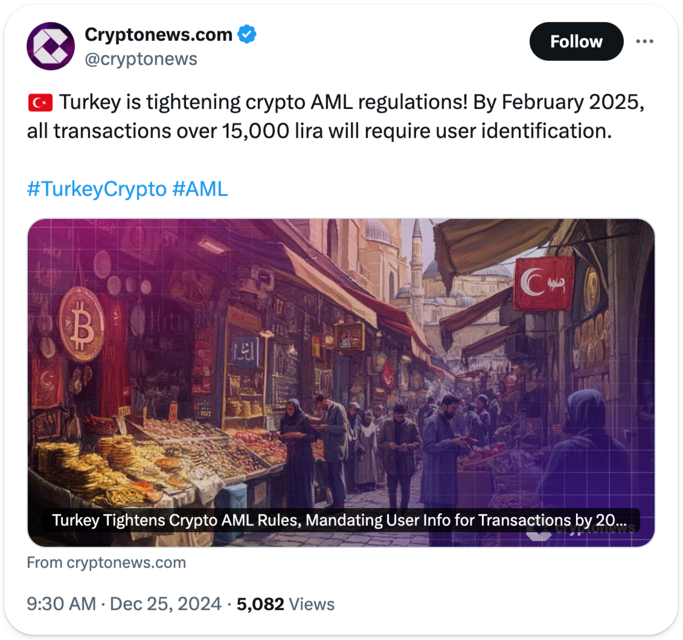 The nation of Turkey is set to introduce stricter anti-money laundering regulations in the new year that will require users executing transactions worth more than 15,000 Turkish lira ($425) to share identifying information with the country’s crypto service providers.