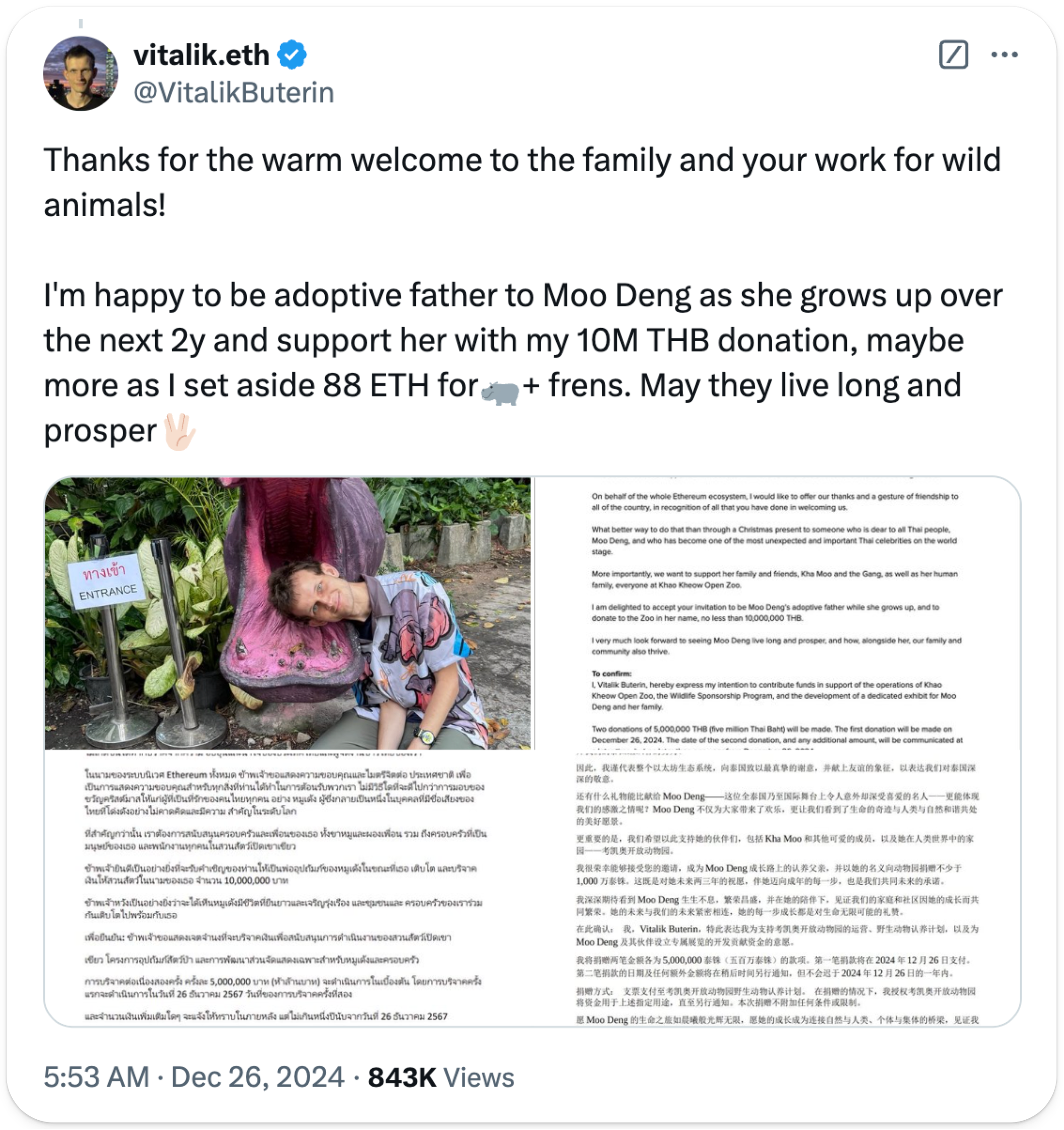 Vitalik Buterin will donate 10M Thai Bhat – worth approximately $292k or 88 ETH – to 'adopt' viral hippo sensation Moo Deng for the next two years. The donation will support operations at the Khao Kheow Open Zoo, fund its Wildlife Sponsorship program, and assist in the development of a dedicated exhibit for Moo Deng and her family.