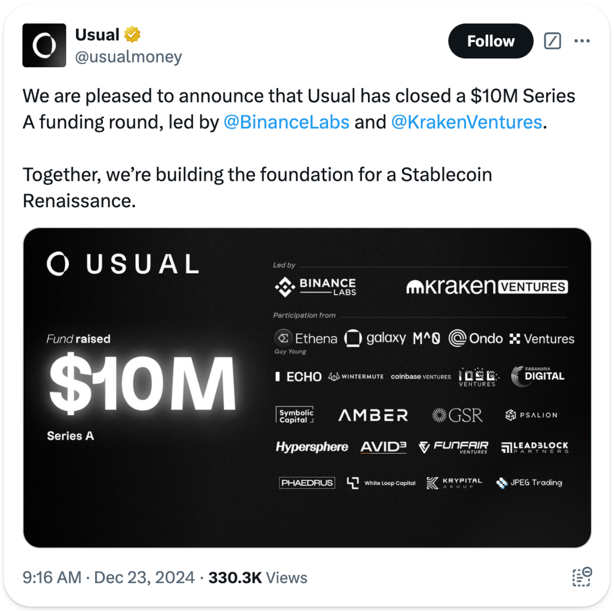 Kraken Ventures have joined forces to lead a star-studded $10M Series A raise for stablecoin issuer Usual. USUAL gained 33% during Monday trading on the announcement, and as of December 25, the cryptocurrency can be pledged via Binance for flexible crypto-collateralized loans.