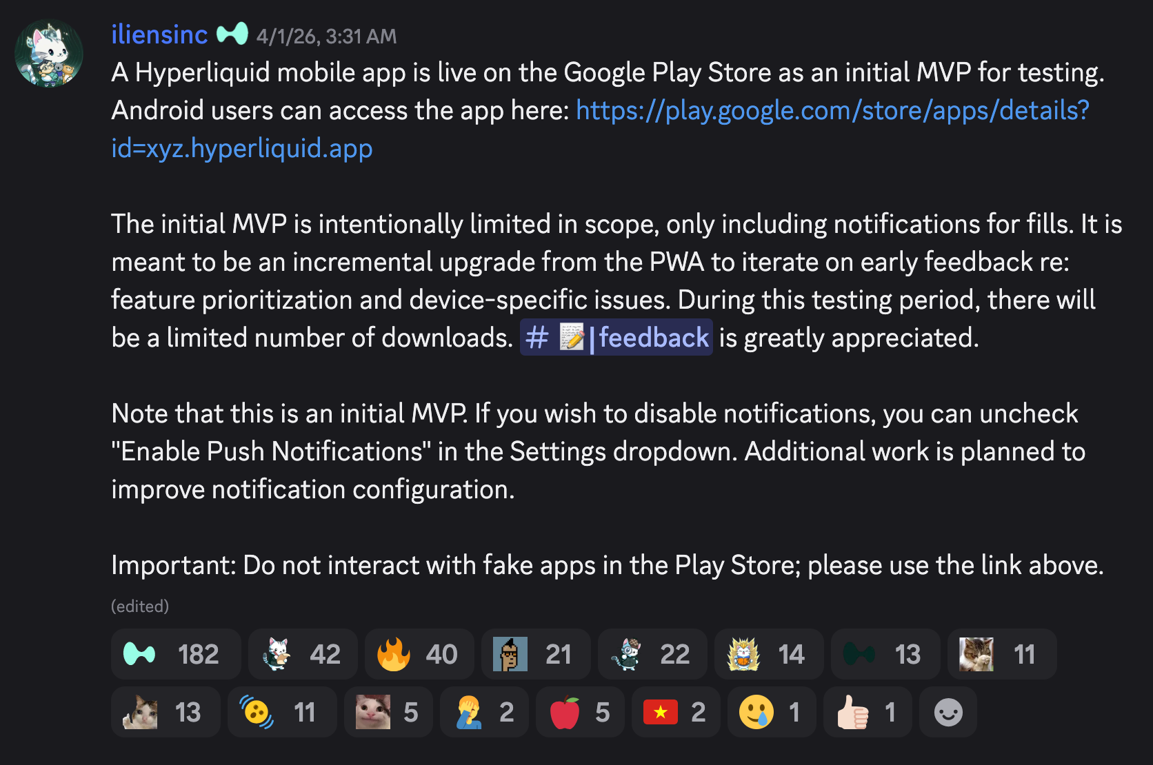- Mobile Ambitions: Anonymous Hyperliquid Labs developer iliensinc has published an announcenement to the Hyperliquid Discord, unveiling the launch of Hyperliquid's mobile app on the Google Play Store. Android users can access the app by navigating to the provided link, and at the time of publication, the application had been downloaded over 500 times.