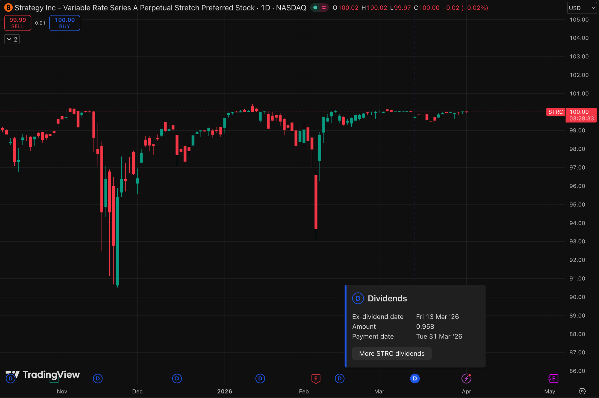 - Ex-Dividend Drop: Until yesterday, STRC had traded below its $100 liquidation threshold since March 13, effectively shutting Strategy out of raising capital through this channel. The drop coencided with the instrument's ex-dividend day, the day which buyers are no longer eligible for the next dividend payment. STRC's next ex-dividend day is expected to occur on April 13.