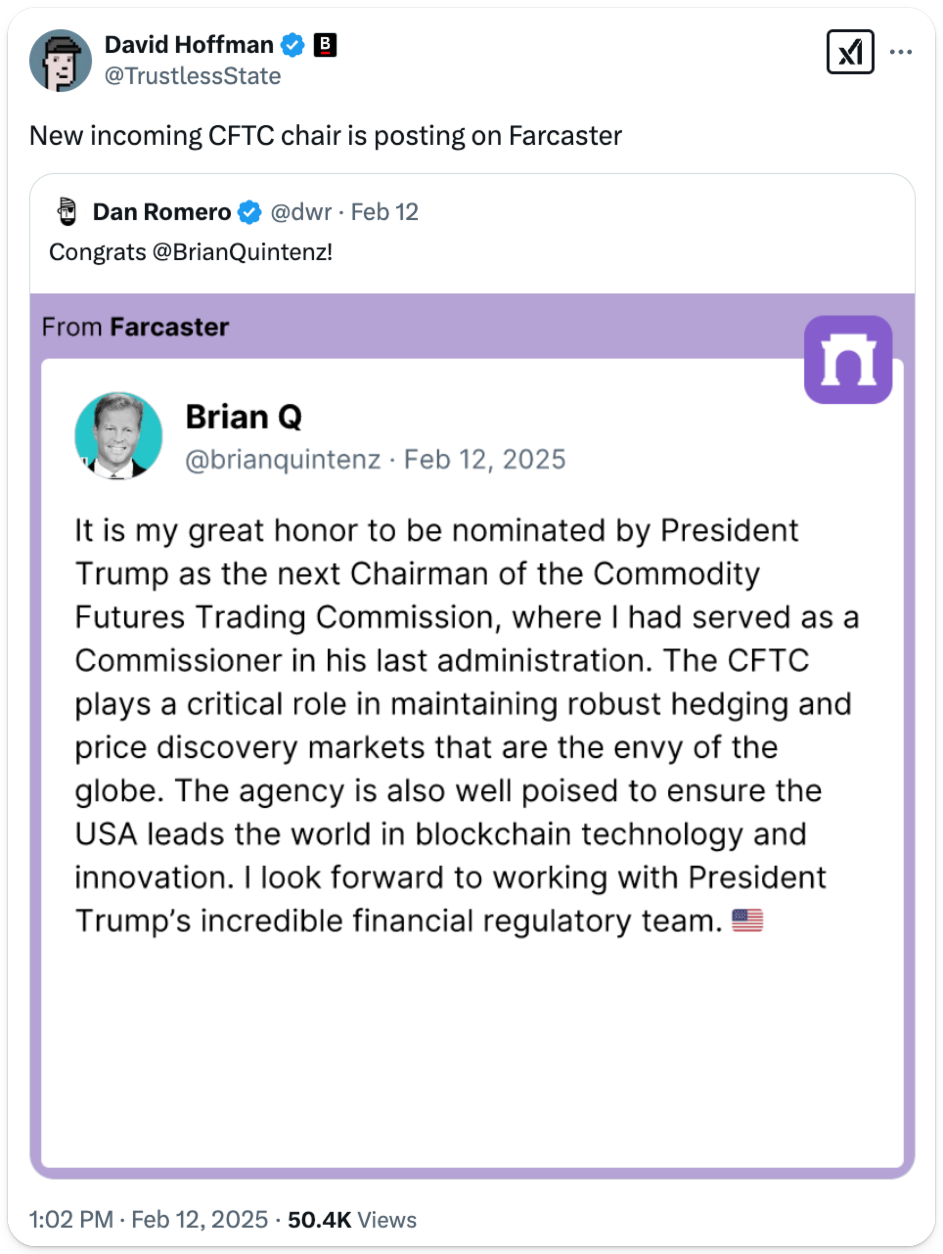 This week, Trump nominated Brian Quintenz to lead the CFTC. Brian Quintenz has experience in the CFTC serving as a commissioner from 2017 to 2021 and is perhaps even more notably currently working at a16z crypto as their Global Head of Policy. If Quintenz were to be put in charge of the CFTC, he would have the responsibility of managing the CFTC's regulatory and enforcement agenda. This nomination by Trump highlights his campaign promise of making the US the crypto hub of the world.