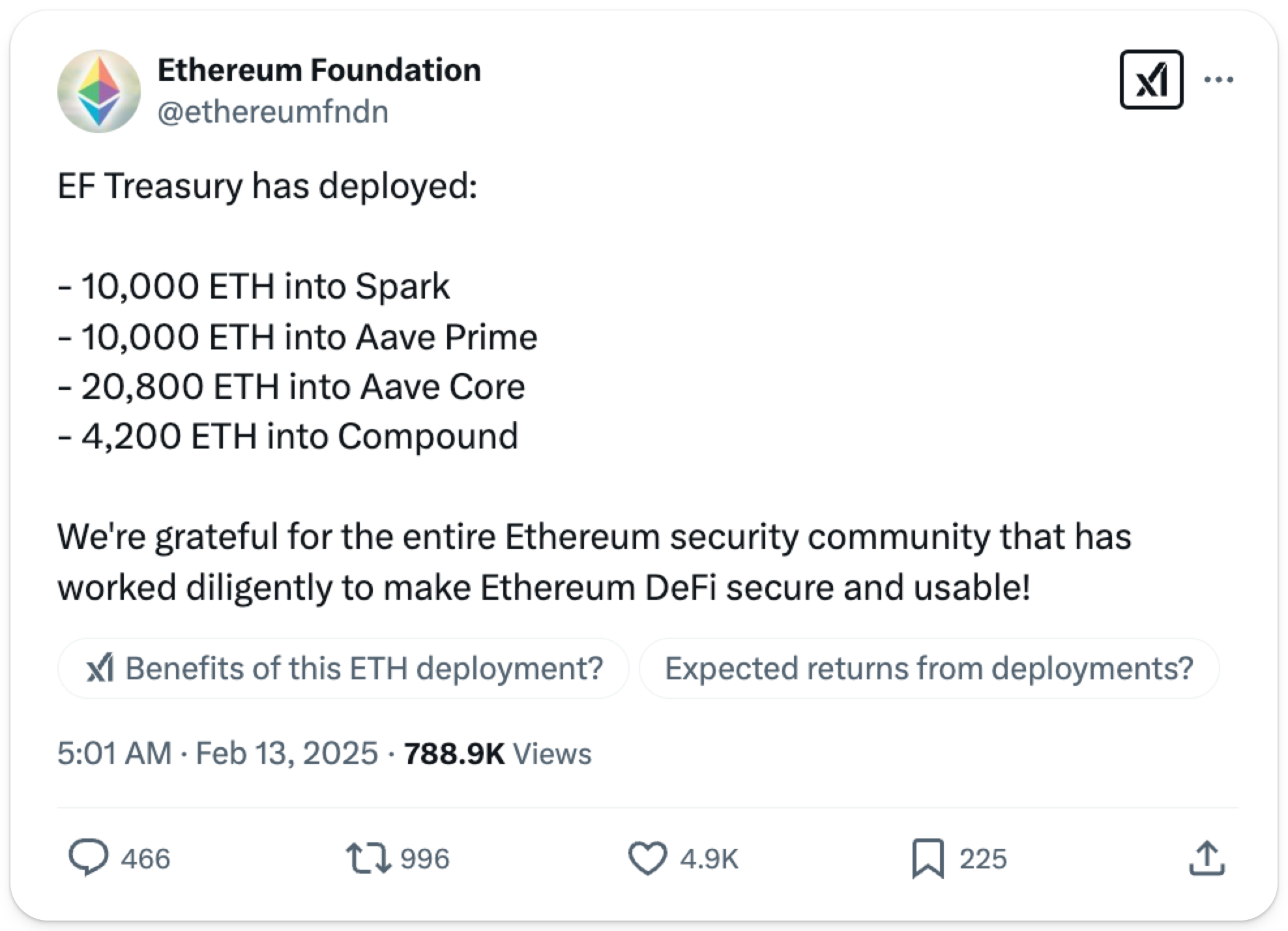 Ethereum Foundation Begins Deploying ETH