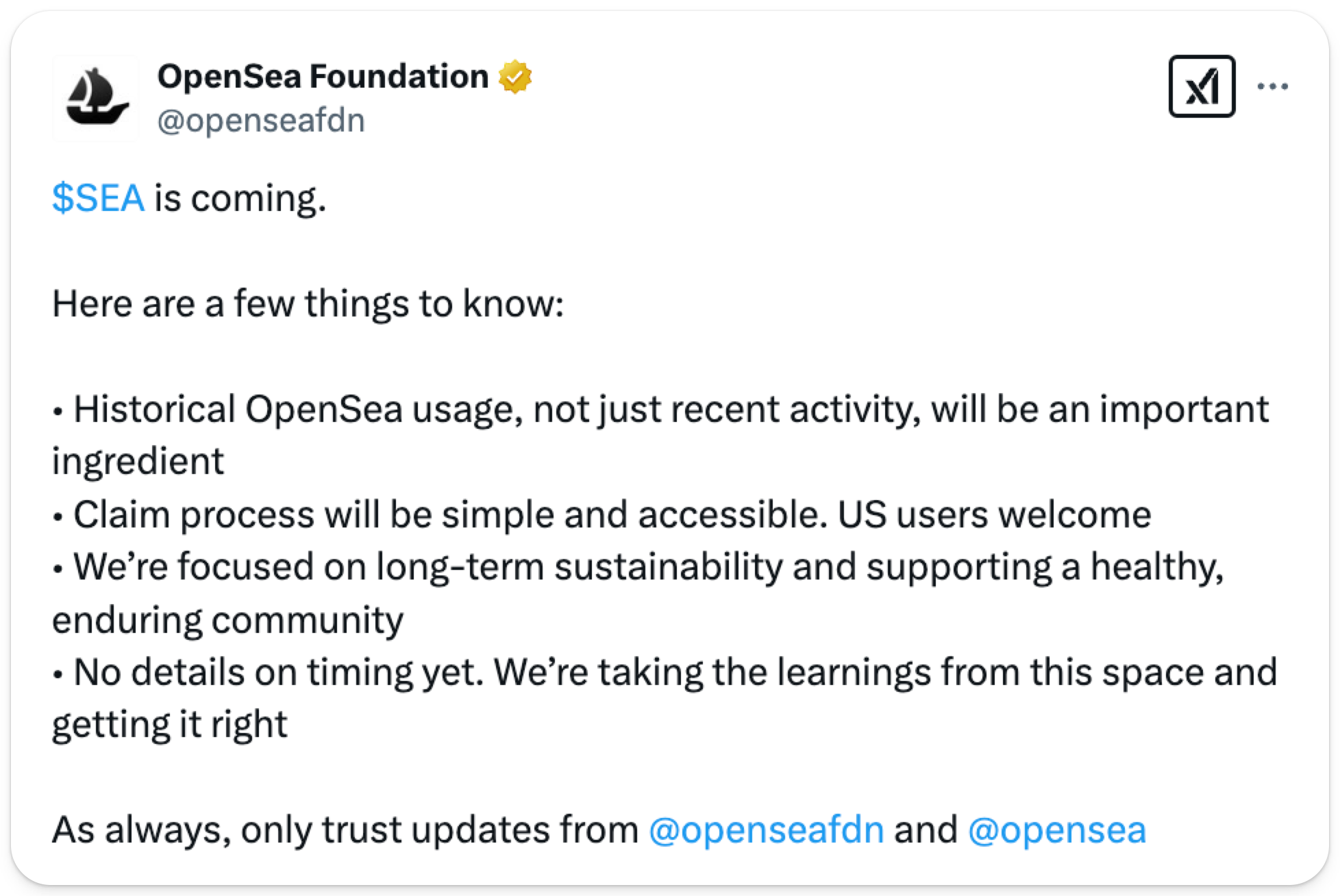SEA is coming. The OpenSea Foundation tweeted earlier this week hinting at criteria for the SEA airdrop. While no official announcements are out there regarding tokenomics or a release date, the tweet details that historical usage of OpenSea will factor into the allocation of the airdrop that users will receive, and U.S. users will indeed be able to claim their allocation.
