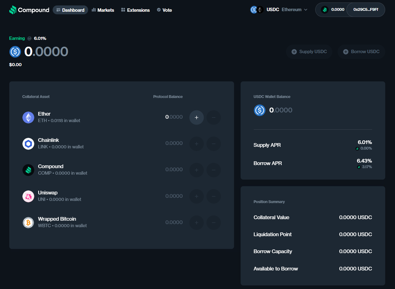 To use Compound, connect your Ethereum wallet to the platform at app.compound.finance.