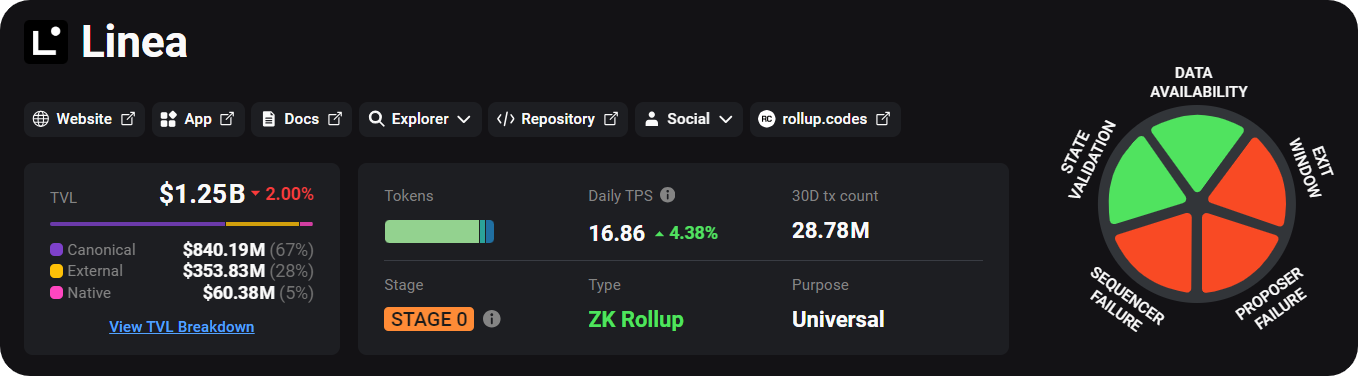 - Today, Linea is the 7th-largest L2 in the Ethereum ecosystem with $1.25 billion in total value locked (TVL).
