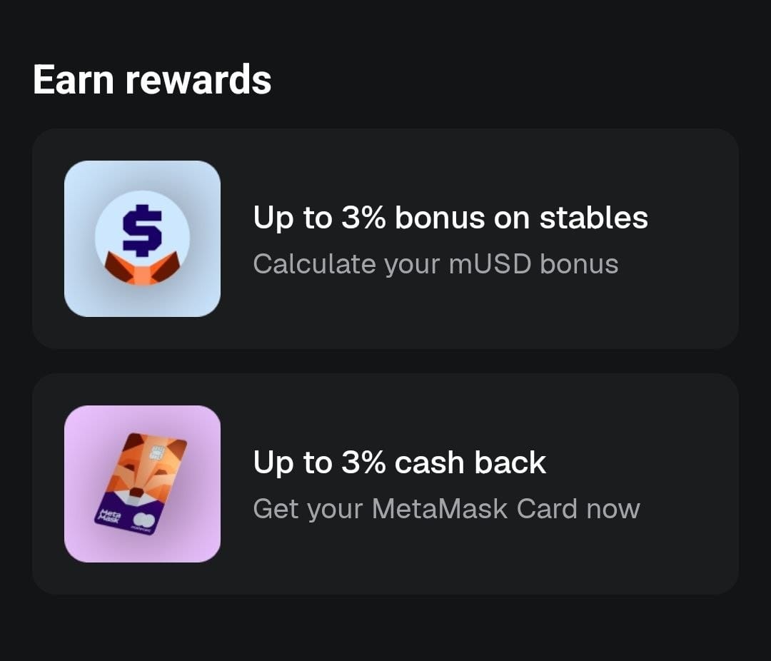 The MetaMask Card is a debit card for spending stablecoins directly from your wallet at +150 million merchants. The virtual card (no annual fee) earns 1% cashback in mUSD, while the Metal card ($199/year) earns 3% cashback on the first $10,000 spent annually. Separately, users who convert stablecoins to mUSD can earn a bonus of up to 3%.