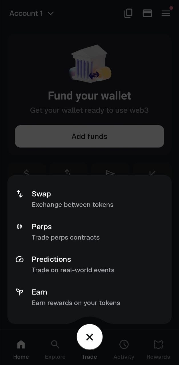 Beyond adding and sending crypto, from the home screen you can access four unique hubs: Explore (for searching tokens/web URLs), Trade (for swaps, perps, predictions, and staking), Activity (for tracking your transactions), and Rewards (for the MetaMask Card dashboard and mUSD conversion bonus claims).