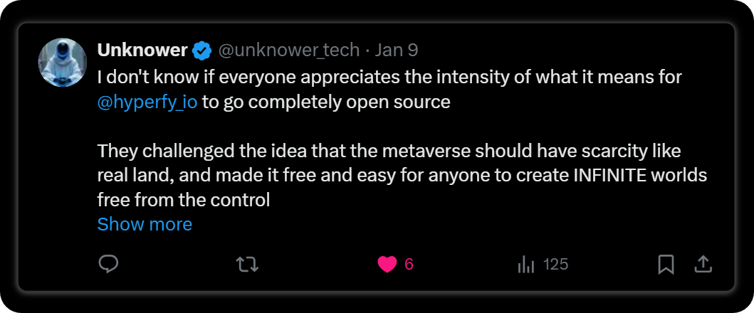 There are no inherent limitations to virtual land, and more free virtual land can always be created. Hyperfy's now on the right side of this paradigm, and I think this dynamic can greatly help to unleash its potential over time.