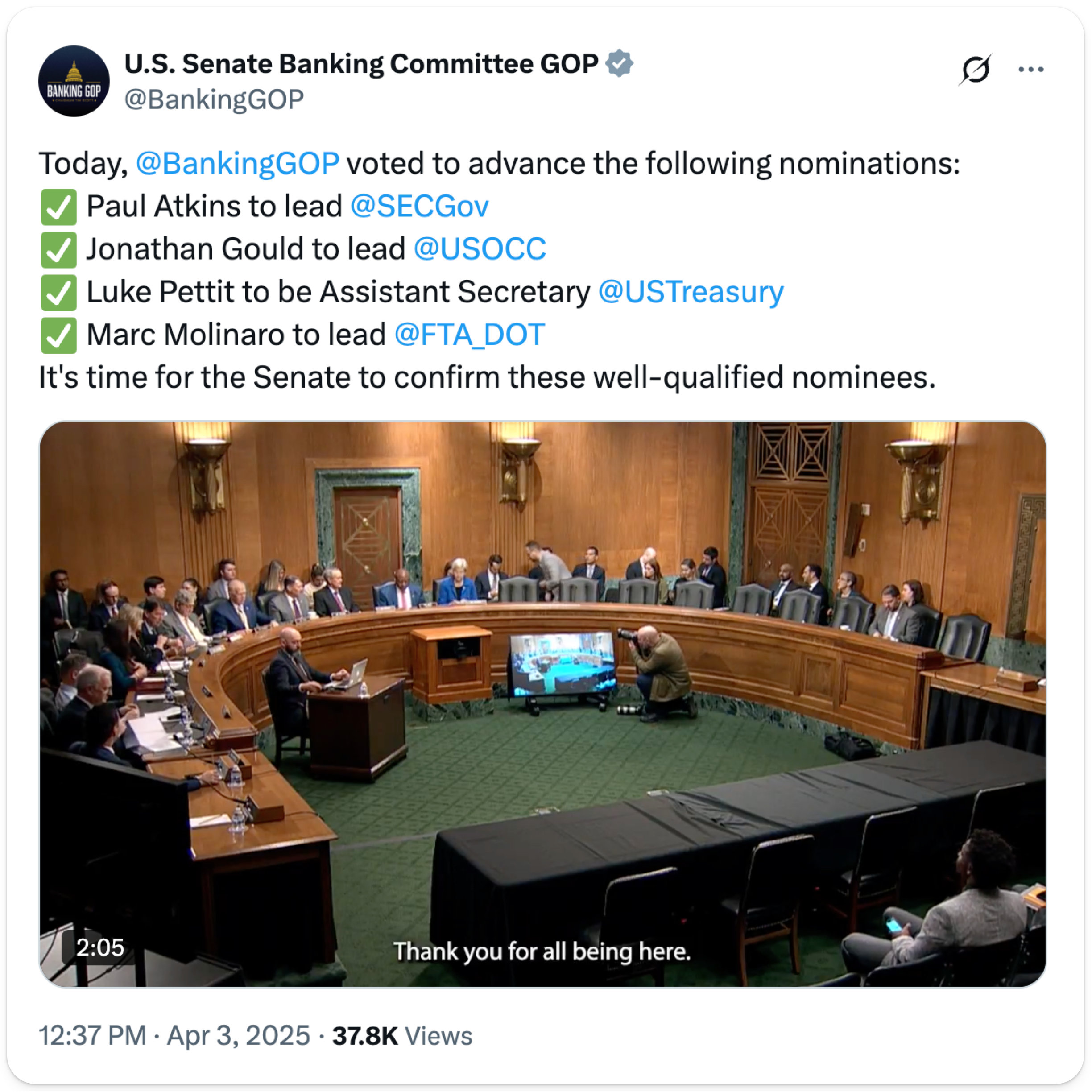 Trump's pick to run the SEC is well on his way to confirmation as Republicans vote him through while outnumbered Democrats voice their opposition. On Thursday, the Senate Banking Panel voted to advance Paul Atkins to run the agency. Next up is Senate confirmation.