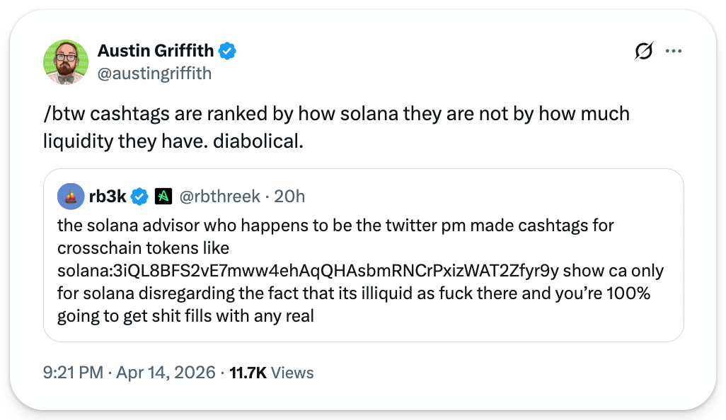 - Fairer liquidity navigation: Right now, it seems Cashtags are prioritizing the Solana instances of multi-chain tokens. As we said, Bier is an advisor to Solana so there's no mystery why, but it'd really be useful to be able to sort and browse these sorts of tokens by their liquidity so you can surface the best swap points.