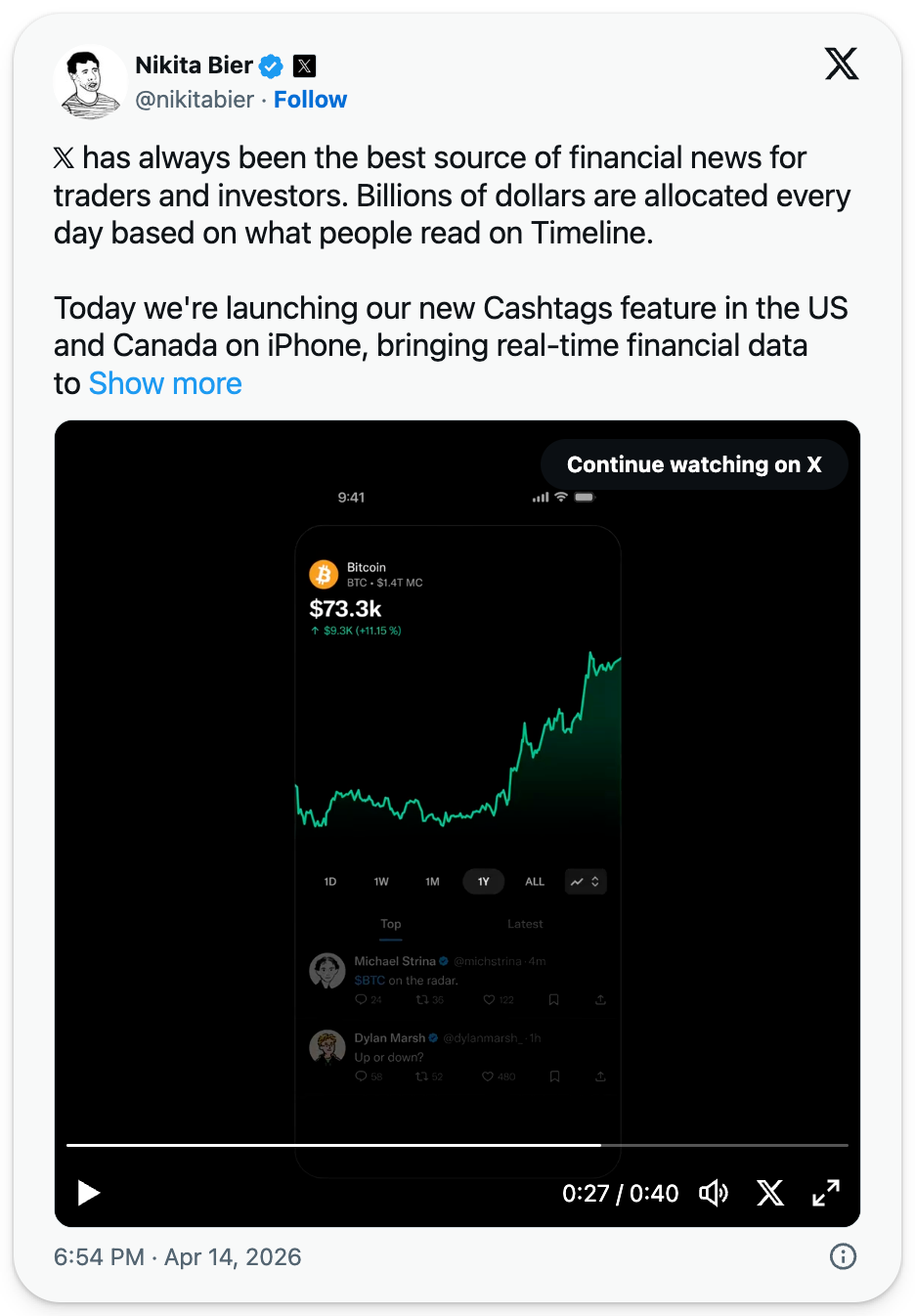 Fast forward to this week, and the platform just made its latest push here with the rollout of revamped Cashtags, allowing users to browse live price charts and related posts directly in their feeds for crypto + stocks.