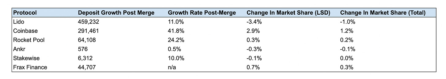Lido’s slower growth rates are to be expected, as it's far easier for a smaller protocol to grow at a faster clip than a larger one. However, when taking a look at who is attracting deposits of newly staked ETH after the merge, we can see signs that the protocol’s chokehold over liquid staking may be beginning to loosen.