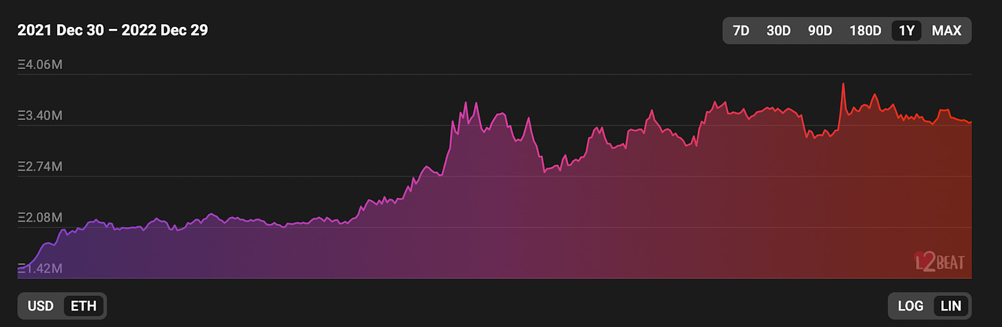 The USD value of assets bridged onto L2s fell 28.6% from $5.7B to $4.1B. However, this is likely attributable to a fall in crypto prices rather than a withdrawal of user funds, as ETH denominated TVL rose 120.6% from 1.6M to 3.4M. This suggests that net-of-prices, L2s, saw significant liquidity inflows in 2022.