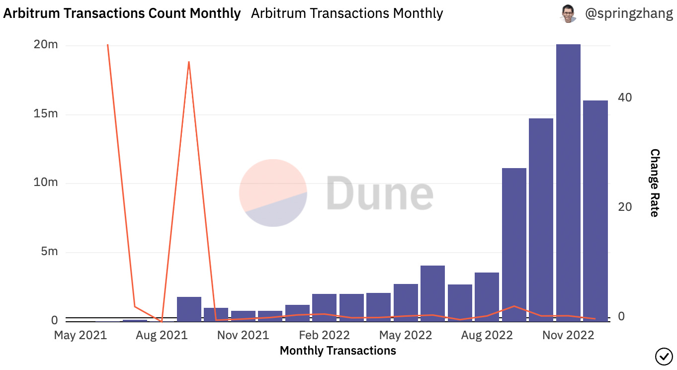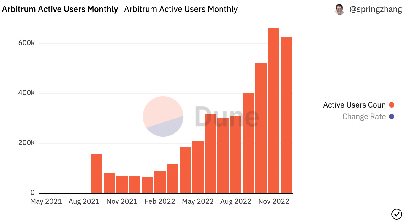 Arbitrum experienced strong growth in active users over the course of 2022 driven by, as previously mentioned, usage of applications like