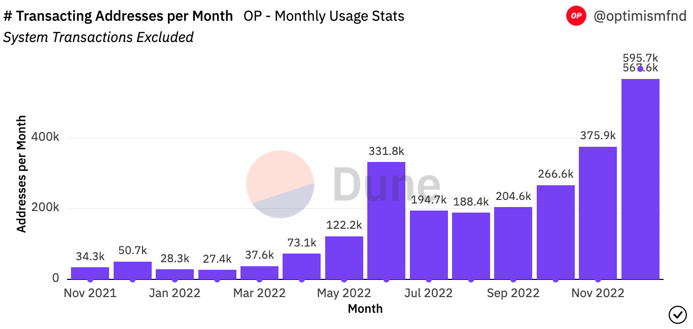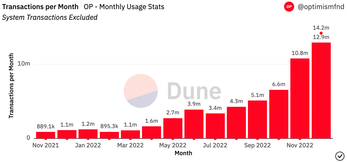 Optimism Monthly Transactions - Source: Dune AnalyticsOptimism has also seen substantial growth in transactions, likely due to increased activity following the OP launch and subsequent incentive programs. Optimism processed 3.2M transactions in Q1 and 30.3M in Q4, a whopping 846.7% increase between these two periods.